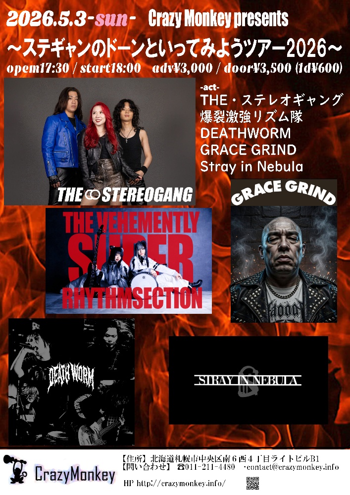 | Crazy Monkey presents ~ステギャンのドーンといってみようツアー2026~ 場所:札幌 CRAZY MONKEY Open 17:30 / Start 18:00 adv ¥3,000 / day ¥3,500 (+drink) THE ステレオギャング/爆裂激強リズム隊 DEATHWORM/GRACE GRIND Stray in Nebula [チケット発売日] 4/1 19:00~ https://passmarket.yahoo.co.jp/event/show/detail/020hxbsawu051.html |